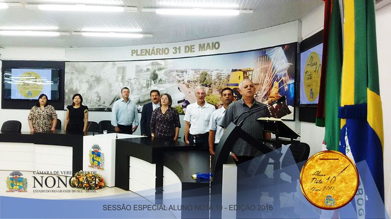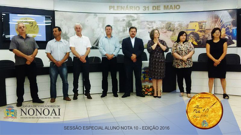A Câmara de Vereadores de Nonoai realizou na manhã desta terça-feira (06), Sessão Especial de entrega de honrarias para os alunos que se destacaram no ano de 2016 em suas respectivas escolas. O ato solene foi presidido pelo Presidente do Legislativo Nonoaiense, Vereador Vilmar Alessi. De acordo com ele, homenagear os alunos é uma forma de incentivar para um futuro melhor. Conforme a Lei que disciplina a premiação (Lei Municipal nº 2.703, de 24 de novembro de 2010), anualmente, são selecionados 2 alunos de cada escola. A escolha é feita pela direção e corpo docente, levando em consideração, além do rendimento escolar, critérios de seleção como pontualidade, comportamento e comprometimento com os estudos, além da participação ativa nas atividades desenvolvidas pela escola. O objetivo da premiação é reconhecer e incentivar o estudo e o bom desempenho escolar por parte dos estudantes. Todas as escolas do município, sejam elas privadas ou públicas, podem participar, desde o ensino fundamental até o ensino médio. O Projeto de Lei é de autoria dos vereadores Paulo Rodrigues e Milton Francisco da Silva. Os Alunos Nota 10, Edição 2016 são: Colégio Cenecista Padre Manoel Gomez Gonzales