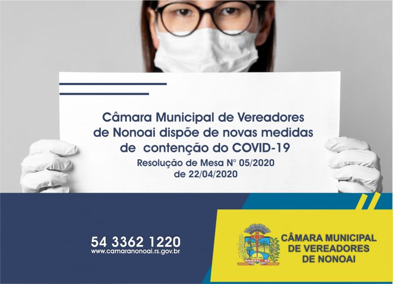 Publicado em 23/04/2020, Por Gabriela Mattes Brustolin - Assessoria de Comunicação da Câmara Municipal de Vereadores de NonoaiA MESA DIRETORA DA CÂMARA MUNICIPAL DE VEREADORES DE NONOAI, no uso de suas atribuições legais com base no inc. II do art. 42 da Lei Orgânica Municipal e inc. I do art. 36 do Regimento Interno, dispõe sobre novas medidas de contenção do COVID-19, revoga resoluções de mesa N° 02/2020 e 04/2020 e dá outras providências através da Resolução de Mesa N° 05/2020. CONSIDERANDO a emergência em saúde pública de importância nacional declarada pela Organização Mundial de Saúde, em 30 de janeiro de 2020, em razão do novo Coronavírus (COVID-19); CONSIDERANDO a Lei Nacional nº 13.979, de 6 de fevereiro de 2020, que dispõe sobre as medidas para enfrentamento da emergência de saúde pública decorrente do Coronavírus responsável pelo surto de 2019; CONSIDERANDO recentes Decretos editados pelo Estado nº 55.184, de 15 de abril de 2020, e do Município nº 020, de 20 de abril de 2020, respectivamente; CONSIDERANDO o dever de preservar a saúde dos servidores e Vereadores frente a pandemia mundial decorrente do novo Coronavírus (COVID-19), RESOLVE: Art. 1º O serviço burocrático da Câmara Municipal de Vereadores de Nonoai, passa a funcionar de forma interna e alternada entre os servidores, de modo a evitar aglomeração, observada escala de revezamento. Art. 2º Permanecem suspensas reuniões no recinto da Câmara Municipal, devendo ser observado por servidores e vereadores. Art. 3º Fica determinado o uso obrigatório de máscaras de proteção facial pelos servidores e Vereadores no interior das dependências da Câmara, devendo ser fornecidas pelo Legislativo. Art. 4º Fica recomendado ao setor de limpeza da casa para que redobre os cuidados com a higienização das dependências do prédio da Câmara. Art. 5º Ficam revogadas as Resoluções de Mesa nº 02, de 17 de março de 2020, e nº 04, de 20 de março de 2020. Art. 6º Esta Resolução entra em vigor imediatamente, vigorando até 30 de abril de 2020, ocasião em que, atendendo a normas estaduais e municipais, deverá ser revista, publicando-se a mesma nos meios de comunicação, redes sociais e afixada nas portas externas do prédio do Legislativo. Para dúvidas ou informações, está disponibilizado o seguinte contato telefônico: 54 3362 1220, horário de atendimento das 07h30min até 11h 30min. E 13h às 17h.