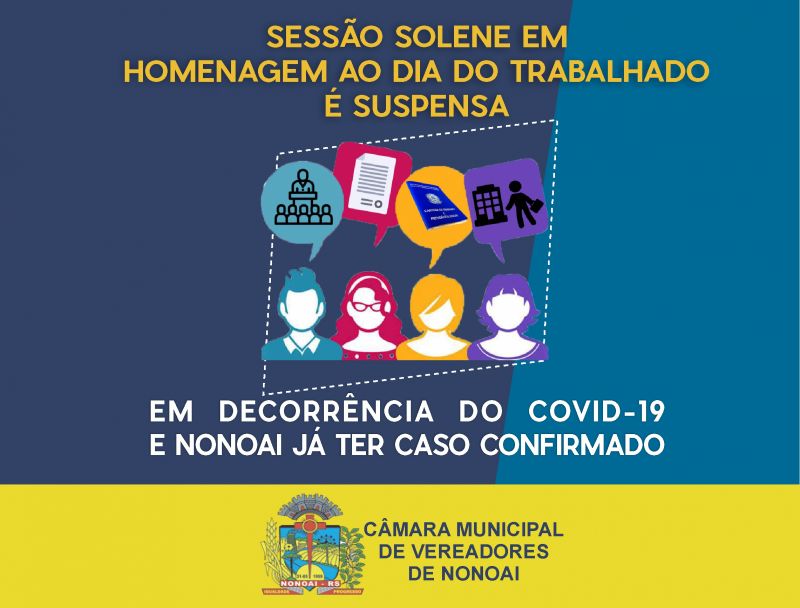 Publicado em 29/04/2020, Por Assessoria de Comunicação da Câmara Municipal de Vereadores de Nonoai O Calendário da Câmara Municipal de Vereadores de Nonoai previa a realização da “Sessão Solene em Homenagem ao Dia do Trabalho” no dia 05 de maio, após a sessão ordinária, mas, devido a atual situação de pandemia e pelo fato de Nonoai já possuir caso confirmado de coronavírus, a Sessão Solene ficará suspensa, mantendo-se apenas a sessão ordinária. A Câmara Municipal de Vereadores aproveita a oportunidade, desde já, para parabenizar os trabalhadores pela passagem do seu dia e, de uma forma especial, os trabalhadores que estão na linha de frente em combate ao COVID- 19.