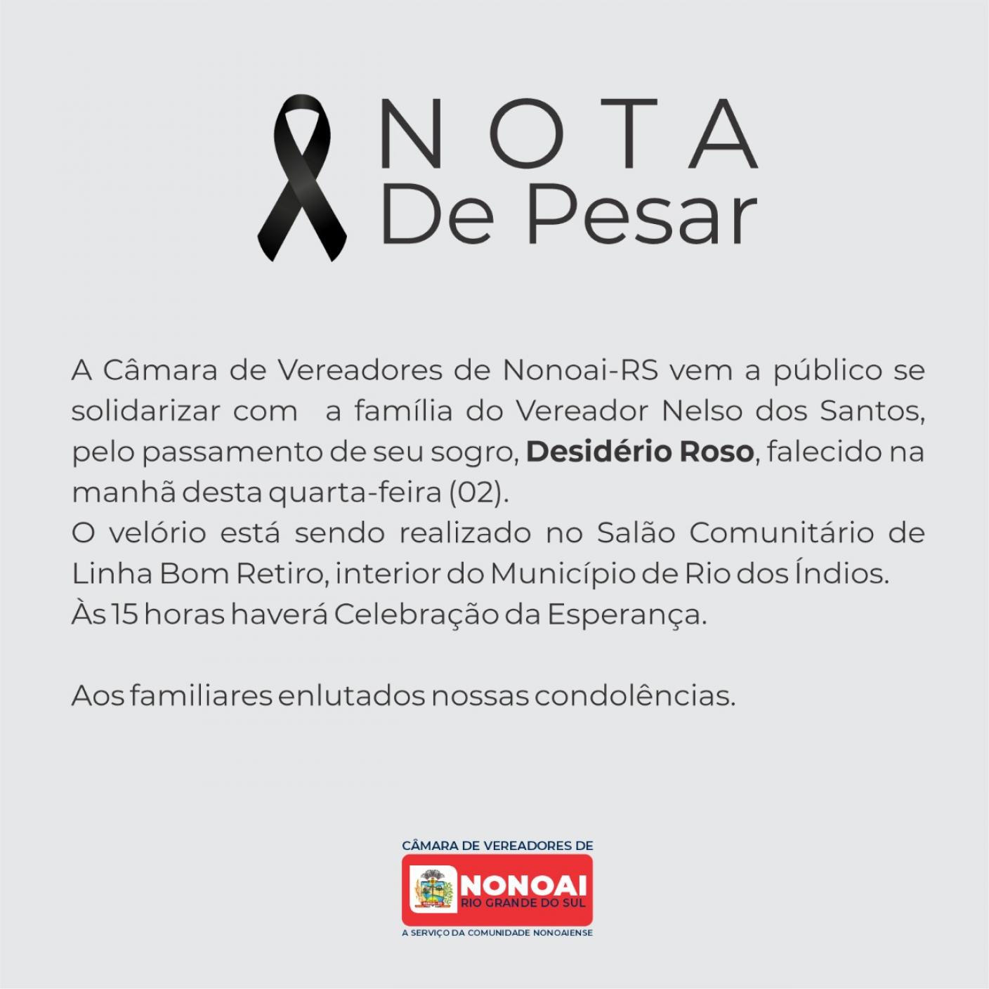 Publicado em 02/02/2022, Por Câmara Municipal de Vereadores de Nonoai - RSA Câmara de Vereadores de Nonoai-RS vem a público se solidarizar com a família do Vereador Nelso dos Santos, pelo passamento de seu sogro, Desidério Roso, falecido na manhã desta quarta-feira (02). O velório está sendo realizado no Salão Comunitário de Linha Bom Retiro, interior do Município de Rio dos Índios. Às 15 horas haverá Celebração da Esperança. Aos familiares enlutados nossas condolências.