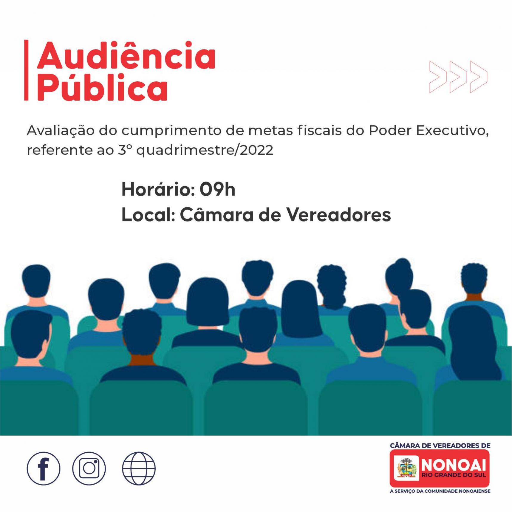 Publicado em 22/02/2023, Por Câmara Municipal de Vereadores de Nonoai - RSA Presidente da Câmara Municipal de Vereadores de Nonoai, Estado do Rio Grande do Sul, no uso de suas atribuições legais, TORNA PÚBLICO, para cumprimento do disposto na legislação vigente, que o Município de Nonoai realizará, na data de 23 de fevereiro de 2023 (quinta-feira), às 09h00min, nas dependências da Câmara de Vereadores, AUDIÊNCIA PÚBLICA para Avaliação do Cumprimento das Metas Fiscais do Poder Executivo Municipal de Nonoai – RS, referente ao 3º quadrimestre de 2022. Para tanto, convida a população, em geral, para participar do evento. Nonoai – RS, 17 de fevereiro de 2023. Registre-se e publique-se. BENILDES CASARIN ZANATTA Presidente --------------------------------------------------------------------------------------------------------