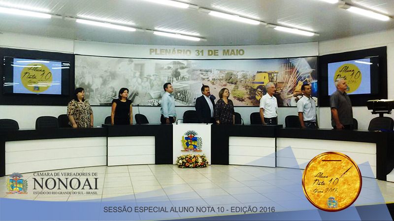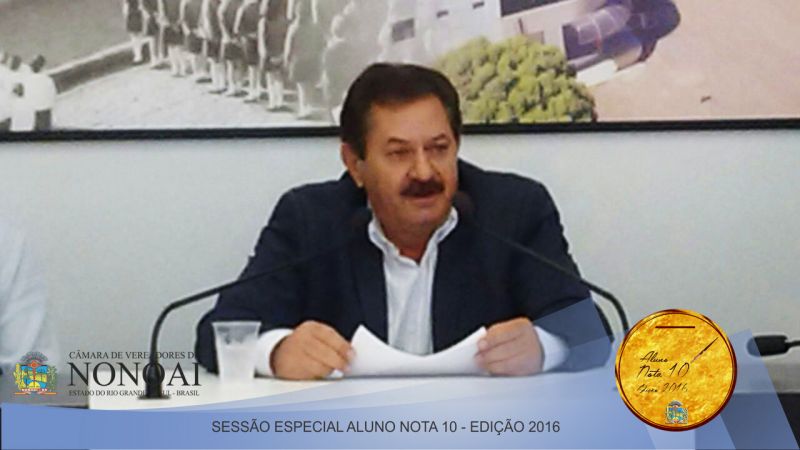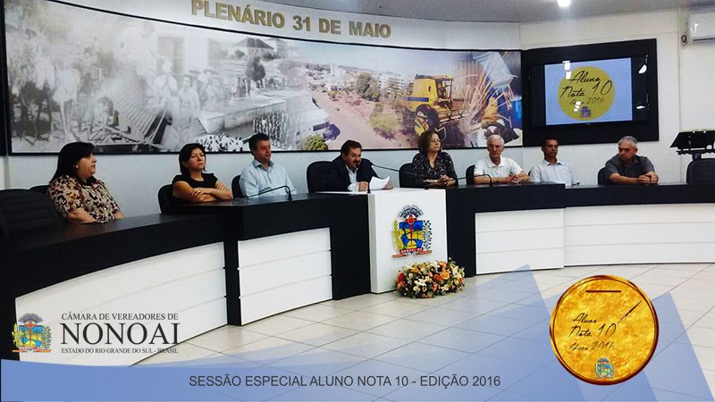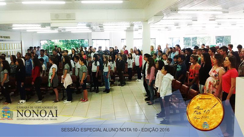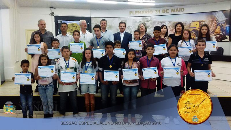 A Câmara de Vereadores de Nonoai realizou na manhã desta terça-feira (06), Sessão Especial de entrega de honrarias para os alunos que se destacaram no ano de 2016 em suas respectivas escolas. O ato solene foi presidido pelo Presidente do Legislativo Nonoaiense, Vereador Vilmar Alessi. De acordo com ele, homenagear os alunos é uma forma de incentivar para um futuro melhor. Conforme a Lei que disciplina a premiação (Lei Municipal nº 2.703, de 24 de novembro de 2010), anualmente, são selecionados 2 alunos de cada escola. A escolha é feita pela direção e corpo docente, levando em consideração, além do rendimento escolar, critérios de seleção como pontualidade, comportamento e comprometimento com os estudos, além da participação ativa nas atividades desenvolvidas pela escola. O objetivo da premiação é reconhecer e incentivar o estudo e o bom desempenho escolar por parte dos estudantes. Todas as escolas do município, sejam elas privadas ou públicas, podem participar, desde o ensino fundamental até o ensino médio. O Projeto de Lei é de autoria dos vereadores Paulo Rodrigues e Milton Francisco da Silva. Os Alunos Nota 10, Edição 2016 são: Colégio Cenecista Padre Manoel Gomez Gonzales