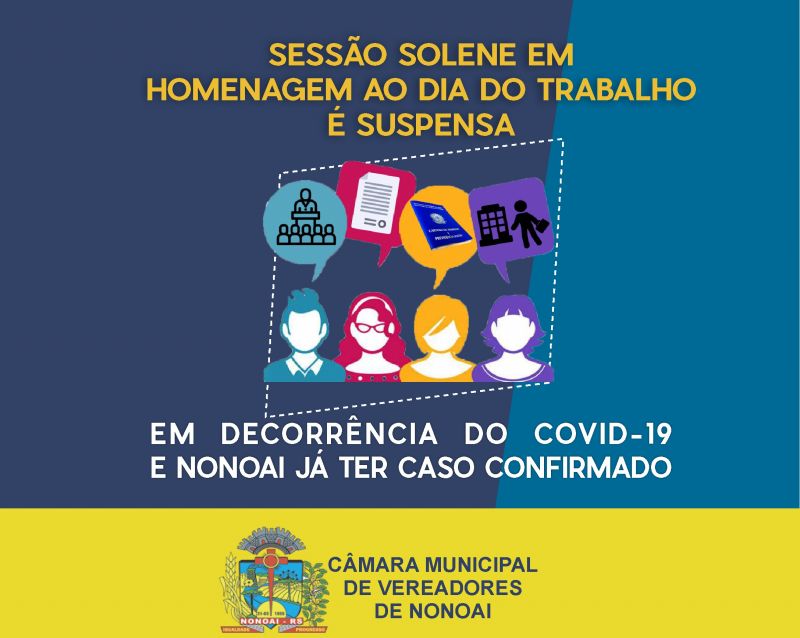 Publicado em 29/04/2020, Por Assessoria de Comunicação da Câmara Municipal de Vereadores de Nonoai O Calendário da Câmara Municipal de Vereadores de Nonoai previa a realização da “Sessão Solene em Homenagem ao Dia do Trabalho” no dia 05 de maio, após a sessão ordinária, mas, devido a atual situação de pandemia e pelo fato de Nonoai já possuir caso confirmado de coronavírus, a Sessão Solene ficará suspensa, mantendo-se apenas a sessão ordinária. A Câmara Municipal de Vereadores aproveita a oportunidade, desde já, para parabenizar os trabalhadores pela passagem do seu dia e, de uma forma especial, os trabalhadores que estão na linha de frente em combate ao COVID- 19.