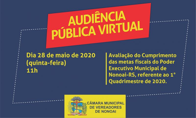 Publicado em 26/05/2020, Por Gabriela Mattes Brustolin - Assessoria de Comunicação da Câmara Municipal de Vereadores de NonoaiO Presidente da Câmara Municipal de Vereadores de Nonoai, Estado do Rio Grande do Sul, no uso de suas atribuições legais, CONSIDERANDO a necessidade de adoção e cumprimento das medidas para enfrentamento da emergência de saúde pública decorrente da pandemia causada pelo Coronavírus (COVID-19); CONSIDERANDO que a situação demanda o emprego urgente de medidas de prevenção, controle e contenção de riscos, danos e agravos à saúde pública, a fim de evitar a disseminação da doença no Município, TORNA PÚBLICO, para cumprimento do disposto na legislação vigente, que, na data de 28 de maio de 2020 (quinta-feira), às 11h00min, será realizada AUDIÊNCIA PÚBLICA VIRTUAL para Avaliação do Cumprimento das Metas Fiscais do Poder Executivo Municipal de Nonoai – RS, referente ao 1º quadrimestre de 2020. Dada a excepcionalidade do momento, os relatórios serão apresentados aos Vereadores através do “Grupo de WhatsApp” criado para a Legislatura 2017/2020, na data e horário supracitados e, após, disponibilizados ao público na página oficial da Câmara Municipal de Vereadores de Nonoai – RS (www.camaranonoai.rs.gov.br). Informações podem ser obtidas através do e-mail: contato@camaranonoai.rs.gov.br.