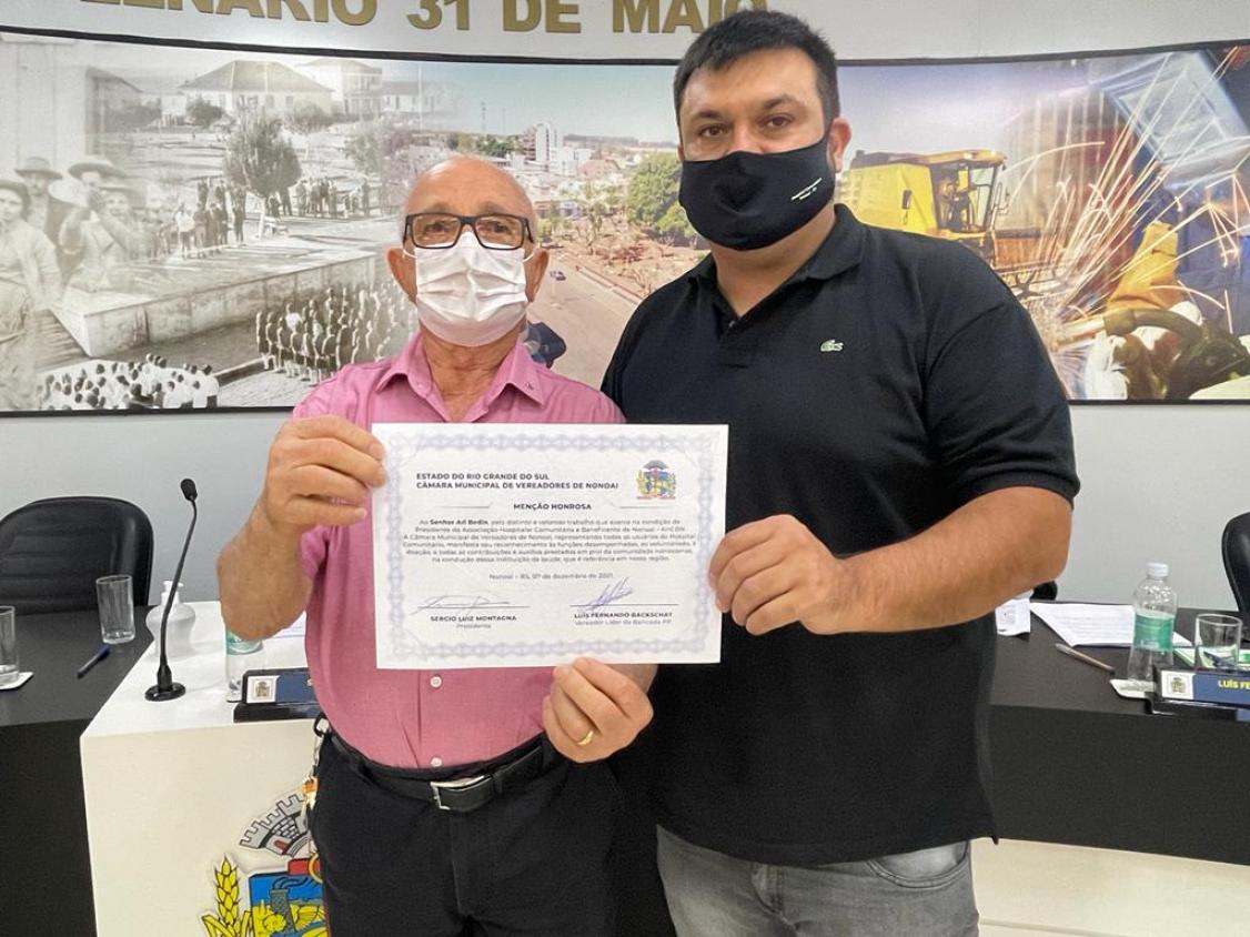 Publicado em 09/12/2021, Por Secretaria da Câmara Municipal de Vereadores de Nonoai - RSAconteceu na data de 07 de dezembro do corrente ano, mais uma Sessão Ordinária da Câmara de Vereadores. Confira as matérias que estiveram em pauta: Informativo Sessão Ordinária - 07/12/2021 Após a Sessão, foi realizada a entrega de Menção Honrosa ao Senhor Ari Bedin, através de requerimento verbal, apresentado pelo Vereador Luís Fernando Backschat, pelo distinto e valoroso trabalho que exerce na condição de Presidente da Associação Hospitalar Comunitária e Beneficente de Nonoai – AHCBN. A Câmara Municipal de Vereadores de Nonoai, representando todos os usuários do Hospital Comunitário, manifestou seu reconhecimento às funções desempenhadas, ao voluntariado, à doação, a todas as contribuições e auxílios prestados em prol da comunidade nonoaiense, na condução dessa instituição de saúde, que é referência em nossa região.