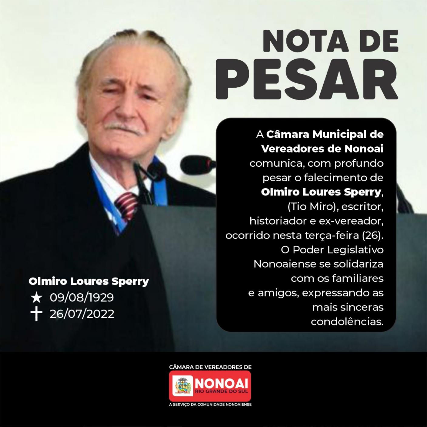 Publicado em 26/07/2022, Por Câmara Municipal de Vereadores de Nonoai - RSA Câmara Municipal de Vereadores de Nonoai comunica, com profundo pesar, o falecimento de OLMIRO LOURES SPERRY (Tio Miro), escritor, historiador e ex-vereador, ocorrido nesta terça-feira (26). O Poder Legislativo Nonoaiense se solidariza com os familiares e amigos, expressando as mais sinceras condolências. NONOAI-RS, 26/07/2022.